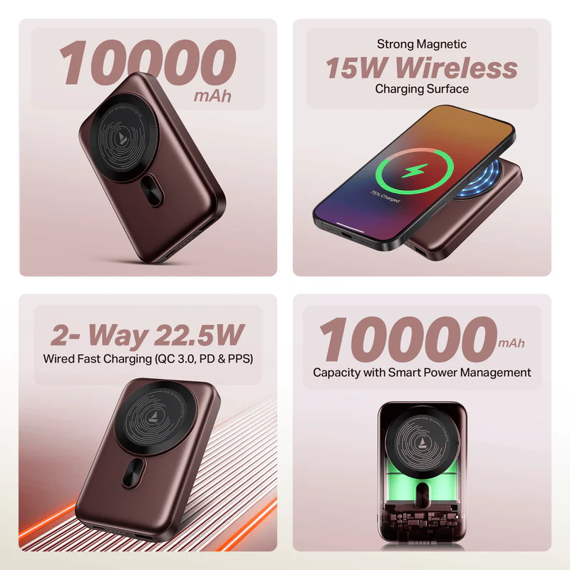 BOAT Energyshroom PB331 Magnacharge Powerbank with 22.5W Fast Charging, 10,000mAh, 15W Magnetic Wireless Charging, 12-Layer Smart IC Protection, 3 Output Ports